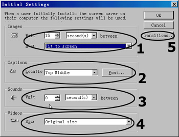 ●1处,设置图片切换时间(单位秒),注意其中的“Size”框设置图片大小,可以选择“Fit to screen”(自适应屏幕大小)。