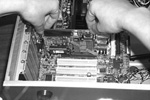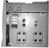将安有主板的机箱板竖起,在机箱内找到安装位置(一般为正对机箱的左面),上紧螺丝(上图中圆框处为螺丝),注意一定要对准位置,标志是主板上的COM口等要从机箱背面的挡板处露出来,以便联结鼠标、键盘等外设。
