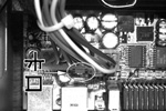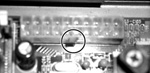 2.现在是联结主板电源。从电源箱伸出的电源线中,有一个最大的矩形塑料电源插头,注意到它的一边有一个卡口(图中圆框所示),对应主板电源插座上的卡口,以便将它们牢固地连在一起。把电源插头往下压,直到卡口卡住为止。