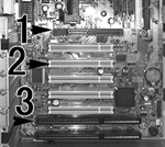 3.接下来应该安装各类板卡了。先看一看主板上板卡的布局,一般从靠近电源箱的地方开始依次是AGP、PCI、ISA插槽,其长度也依次递增。图上1所示即为AGP插槽,2为PCI插0槽,3为ISA插槽,看清楚了。有些“菜”们常常问我,说分不清什么是AGP、PCI卡,小编我只有拜托诸位,弄不清时就拿卡到插槽上比一比,AGP的绝不会比PCI的长,PCI也不比ISA的长。如果这样都分不清的话,为保险起见,你还是不要DIY的好。