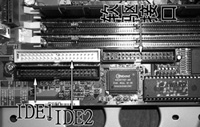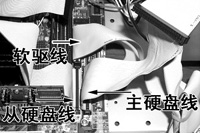 5.接下来该安装外部驱动器了。在这之前先要将数据线装在主板上。一般来说主板上有两个IDE接口,用以联结硬盘、光驱、CDR等IDE设备;一个软盘数据接口,联结3寸驱和5寸驱。IDE接口有主、从之分,通常引导硬盘必须连接在主IDE接口(在主板上标有IDE1的那个)上才能正常引导系统,而光驱、从硬盘等其他IDE设备可连在IDE1上,也可连在IDE2上。