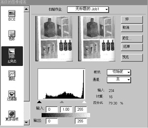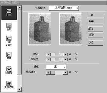 图像增强工具位于设置窗口中,包括:亮度、对比度、曝光量、暗调和高光、曲线、着色、滤波器以及其他选项(图3中下方的五个按钮)。这些工具可使图像在扫描时经过一定的处理而不必使用专门的图像处理软件。