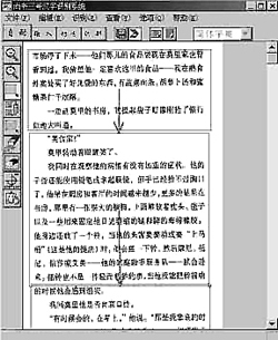 经过以上各种工具的使用以及划分完识别区域后,点击“识别”按钮,即可完成对文件图像的识别,软件自动进入文稿校对画面(如图13),在此界面中可对文稿进行校对,对识别错误的字进行修改,然后再存盘(可存为*.TXT文件)。