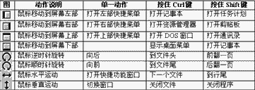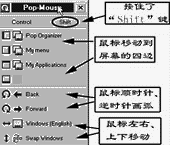 PopMouse预设置了鼠标的增强功能,通过一些鼠标动作(说明可见图2),实现种种操作功能。这些操作功能又分为两大类,一类就是弹出快捷菜单,通过点击这些预定义的菜单完成设定的操作。一类是直接实现某个操作功能,如卷页、打开MS-DOS窗口、切换窗口等。