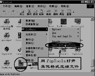 由于压缩文件的格式很多,ZipMagic并不能将其他压缩格式的文件以窗口方式打开,但可以用ZipMagic的类似WinZip工具ZipTools来打开。例如,对一个自解压的文件,用鼠标右键点击该文件,选择弹出菜单中的“ZipMagic/Open with ZipTools”,即可将该文件在ZipTools窗口中打开。操作方法与WinZip类似。