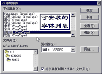 在Win95/98中,文字显示和打印普遍使用的标准字体都是TrueType字体。这种字体也称为轮廓字体,轮廓由一组指令构成,描述了字符的外形。TrueType字体易于使用、屏幕和打印输出效果一致,具有可匀展性、可移植性、与应用程序无关性,并且存储空间小。另外,我们经常使用到的字体还包括位图(点阵)、矢量、设备(如打印机固化字体)等字体。