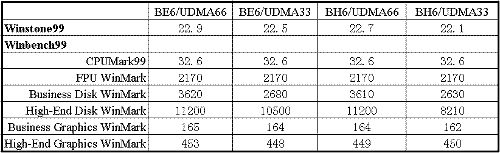 这次测试我们主要考虑了BX主板使用UltraDMA/66和UltraDMA/33的性能差异,并且,为了让大家更清楚地了解BE6,我们还使用了BH6作为参照。