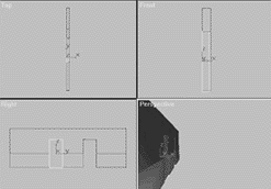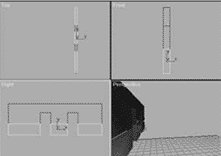 现在的“Wall01”造型好像一把只有三个齿的梳子,下面我们要创建三个方体分别放置在这把“三齿梳”的三个“齿”上,作为走廊墙面的墙围部分。为了叙述方便,在下面的内容中,我们就用“齿”来表示墙面主体下端的三部分墙面。