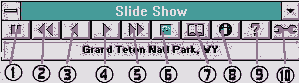 软件运行后的面孔(如图1)主要为一工具条。其表示的功能从左到右依次为:1暂停2快进3前一图片4下一图片5快倒6选择不同图片集中的图片7有关作品的更多信息8软件老家信息9帮助信息10系统配置。