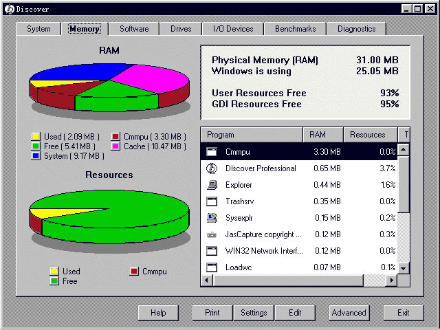 EZ Setup的作用是改变Windows系统的“外表”,即桌面、图标、系统启动时所加载的程序、各种菜单的组成方式、启动和关闭画面等,虽然其中有些项目可以经由控制面板来设置,但EZ Setup涉及的面更周全,而且使用也相当简便。 Discover是一个系统信息检测工具(图5),检测的范围包括了CPU的类型,内存、硬盘、各接口的状态、驻留程序所消耗的内存大小等情况,并可与N&B内置的标准资料作比较。由于提供了极其丰富的图示,所以即便你是一位初学者,也能一目了然。以上对N&B的一些主要功能进行了介绍,其实还不止这些,如果朋友们感兴趣,可以通过网址http:∥wwwnaicom或http:∥wwwhelixsoftcom获取最新信息。