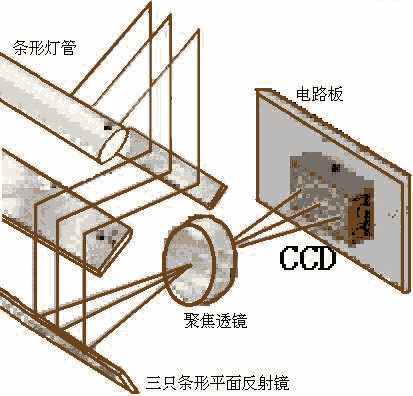 使用CCD器件的扫描头由光源(条形灯管)、三只条形平面反射镜、聚焦透镜(透镜组)和CCD电荷耦合器件组成(如图6)。条形灯管和条形平面反射镜在扫描头上沿水平方向放置。扫描仪工作时条形灯管发出的平行光线经图稿、条形平面反射镜反射后经聚焦透镜(或透镜组)进入CCD,由CCD将光信号转换为与光强度成正比的模拟电信号。1.光源
