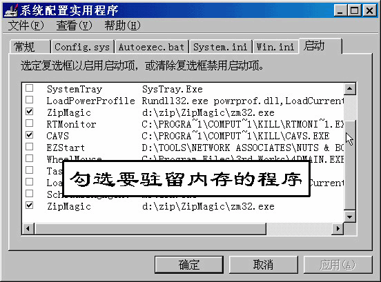 有些随着系统启动而驻留内存的程序,如果要设置它不自动启动,可以看它在“开始/程序/启动”菜单栏中是否有快捷方式,如果有,就直接删除。如果没有,可以在图2所示的系统信息程序界面中,选择菜单“工具/系统配置实用程序”,然后选择“启动”标签,在该标签窗口就可以选择要自动启动的程序(图3)。例如,你可以设置不自动启动“计划任务”工具。如果你认为当前病毒传染的危险性不大,也可以选择不自动启动实时病毒监测程序。经过精心选择必备的自动驻留内存的程序,是可以节约很多内存空间的。