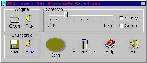 相信多数音乐爱好者可能都喜欢将一些优美的WAVE音乐文件收藏起来以供随时欣赏,不过就如同再出色的博物馆中也难免会有一些有残迹的收藏品一样,这些WAVE声音文件中也必然会有一些文件中存在着嘶声或杂音的情况,它们如同“鸡肋”一般:听吧,效果不好;删吧,心有不甘,许多用户对此深感头痛。别着急,WAVclean可为你解决这一问题。WAVclean是一个被誉为“清洁工”的WAVE声音文件优化软件,它可将WAVE声音文件中的背景嘶声或杂音去掉,只保留其中的音乐信息,从根本上解决了长期困扰用户的杂音问题。同时,WAVclean还可将原本8位的单音道声音文件转成16位立体声文件,可更好地满足广大音乐爱好者的需要。WAVclean的界面比较美观(如图),操作也比较简单,我们只需单击“Open”按钮打开需要“清洁”的WAVE声音文件(可利用Ctrl键同时选择多个声音文件一并进行处理),然后再利用“Play”按钮对这些声音文件进行监听,以此确定哪些文件需要进行优化。确定需要优化的文件后,用户可根据实际情况选择是对声音文件进行澄清嘶声(“Clarify”选项),还是净化杂音(“Scrub”选项),并同时在“Strength”框中选择需要处理的力度。最后单击“Start”按钮,WAVclean就会按照用户的要求对指定的WAVE文件进行“清洁”处理。优化完毕后,我们可利用WAVclean下面那个“Play”按钮对优化后的声音文件再次进行监听,其效果一般比优化前要好得多,从而满足了用户的要求。当然,用户若对优化的结果不满意也可重新调节优化力度,然后再次进行优化,直至满意为止,不过最后别忘了利用“Save”按钮对优化后的文件进行存盘哦!