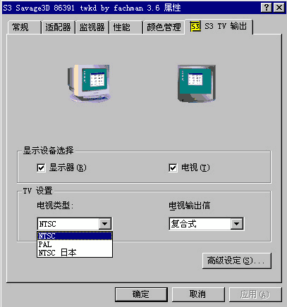 Tweak的公板驱动程序,可以到http://file.mydrivers.com/display/s3fach38.exe去下载)。在“电视类型”中你可以选择各种不同的制式,其中PAL为中国的标准