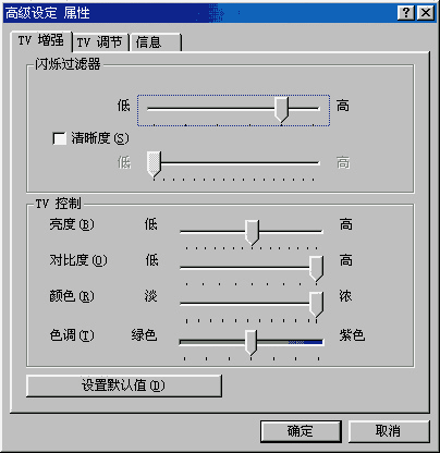 制式,而NTSC是美国日本等地采用的制式。一般情况下只要你的电视机是多制式的,选择各种制式都可以。至于我这台“高性价比”的电视嘛,选择NTSC制式图像会变成黑白的。“电视输出信”其实应该是“电视输出信号”,这是驱动程序的BUG。在这一项中你可以选择信号的输出方式,通常有“复合式”和“S-Video”两种,其中复合式就是我们所用的混合视频输出,“S-Video”就要用上文提到的S端子了。我们接着来进行高级设定(如图11):