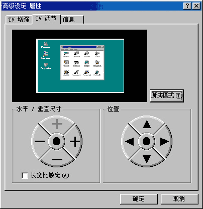 “闪烁过滤器”可以使画面看起来更稳定些;“清晰度”调节滑杆可以手动改变电视输出画面的清晰度,不过这种清晰度是采用抖动方式实现的,虽然文字看起来清晰了一些,但是画面的闪烁却明显了许多,得不偿失。“TV控制”下面有关于亮度、对比度、颜色、色调的调整,和电视机自带调节功能的差不多,大家可根据个人喜好调整。点击图11上面的“TV调节”选项卡,可以进行电视画面尺寸的调节(如图12)。调节方法很简单,和显示器的调节方法一样。如果你的显卡输出到电视上的画面不能满屏或者偏向一边,这个调节功能还是有点作用的,不过它能调整的幅度有限,在我这台电视上画面无论如何也调不正。
