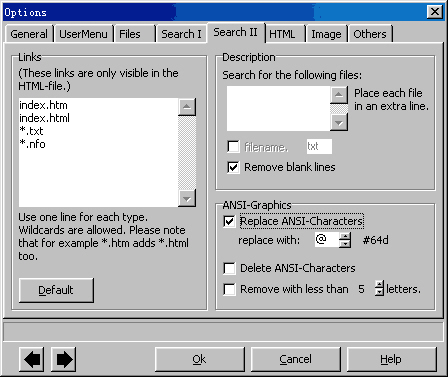 Ⅱ”)标签卡中(见图6),所有设定仅仅对生成的HTML文件起作用,首先是创立在HTML文件中自动生成链接的文件类型,同样是以通配符的形式书写。在描述“Description”一项中指定读取file_iddiz和infotxt等压缩文件中的说明描述内容;在ASCII图形“ANSI-Graphics”选项中设定删除或替换file_iddiz或infotxt文件中的ASCII字符,设定完毕以后就可以放心地提取文件中原有的说明描述。对应HTML文件的格式、颜色的设定可以在HTML标签卡中作相应的改变,这对于熟悉编写网页的电脑爱好者来说相当方便。在图像(“Image”)标签卡将设定读取JPEG、GIF图像文件的方式以及生成缩略图的大小、边框的样式等。