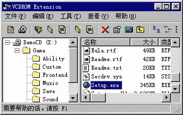 “文件/新建”,输入“光盘”文件名:E:\If2000.vcd,“光盘”名缺省为DomeCD;“编辑/添加文件”,将光盘根目录下的文件添加到DomeCD的根目录中(Readme等几个文件完全可以不选);“编辑/添加空目录”,目录名为Game,注意如直接添加目录Game,“光盘”DomeCD会很“肥”的哟!将光盘Game目录中的三个文件添加到DomeCD的Game中之后再“添加目录”,依次添加光盘Game文件夹中的Ability、Source、Custom、Save等几个文件夹,有关声音、动画的文件夹可别添加进去了,我们下面要对它们动“手术”。