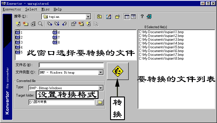 先在“搜寻”栏中选择要转换文件所在的目录,然后在“文件类型”下拉列表框中选择所要转换文件的类型,如JPG。由于类型比较多,因此查找类型就比较麻烦,建议直接在下拉列表框的后面选择“All image files”(所有图像文件)项,这样在上面的文件列表窗口中就列出了该目录下的所有图像文件。也可以选择“All sound files”(所有声音文件)项列出所有的声音文件。用鼠标选择文件列表窗口中要转换的文件,也可以按住“Shift”或“Ctrl”键选择多个要转换的文件,选择的文件名称就列在“文件名”文本框中,按回车就可以将这些选择的文件列在界面右面的转换文件列表栏中。通过这种方法,可以在不同目录中选择多个文件,实现文件的批量转换。不过要注意的是,选择的文件类型要相似,不能一些是声音文件,一些是图像文件。