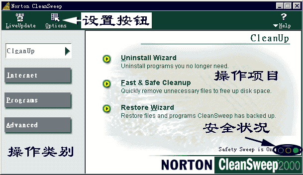 如果要启动CleanSweep的主程序,可以点击桌面扫帚状的快捷启动图标Norton CleanSweep(也可以从开始菜单中启动),程序的主界面不是常见的Windows窗口界面,而是一个页面标签窗口(图2),界面右面列出了四个功能类别标签,分别是“CleanUp”(卸载程序和清除文件)、“Internet”(关于因特网的清扫项目)、“Programs”(程序的备份、移动等)、“Advanced”(其他高级清扫项目)。点击某个标签,界面右面窗口就列出其中的功能项,点击某个功能项,即可按照该功能项的操作向导开始操作。