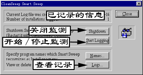 CleanSweep最强大的功能就是能够记录程序的安装过程和文件的拷贝过程,这样在卸载程序的时候就可以做到心中有数。一般经过CleanSweep监视安装的程序,能够做到不留痕迹地卸载,所以,如果你经常试用软件,又想保持系统的整洁,使用CleanSweep的智能监视清扫工具是最好的选择。点击任务条状态栏中的CleanSweep的智能监视清扫工具图标,打开窗口(图3),然后选择“Start”启动记录,CleanSweep的智能监视工具就开始工作(可以看到状态栏图标闪动)。这时候,你的一切安装或拷贝工作都将被记录下来。安装或拷贝完成后,再打开图3所示的窗口,点击“Stop Logging”(停止记录),然后监视工具弹出一个对话窗口,提示已经记录安装或拷贝过程,你可以在下面的“Description”栏中添加本次记录的注释,例如“11月3日安装WPS2000”,点击“Summary”按钮可以查看安装或拷贝的详细细节。