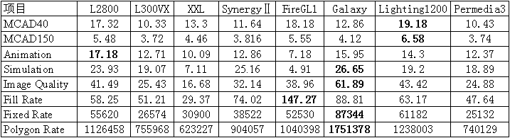 首先是CAD测试项,我们运行的软件平台是AutoCAD2000,测试软件为CAD ALYST杂志编写的“C99 bench”,这一测试软件将运行几个CAD实程序(以LISP文件为主),然后根据时间计算成绩(测试结果参见表四)。出人意料的是,在这一测试项中胜出的是本次测试中最廉价的显卡——Permedia3,我们推测原因是AutoCAD对显卡几何运算能力要求不高,甚至有可能是通过2D软件模拟运行的3D Test,所以这显卡的2D性能对该测试至关重要,看来3Dlabs的产品(包括Permedia3、VX1和GVX1)在2D领域确实有独到的地方。而最后一名——Lighting1200的“主攻方向”不是AutoCAD,其2D引擎是由Cirrus Logic提供,所以得分偏低。