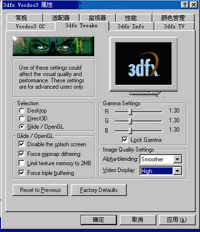 假定你已经正确安装了驱动程序,你将在显示属性里看到“3dfx Voodoo3”一项:在桌面上右键单击选“属性”,点顶端的“设置”然后点“高级”按钮,选择“3dfx Tweaks”选项,这里有不少设置能改变游戏和应用程序的界面和应用方式。首先点“Desktop”单选框,这里只有一个选项:“Gamma”。它是调节亮度的。当你桌面看起来过亮或过暗时可以调节。