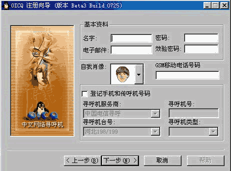 ICQ的注册用户,还可以选择“使用兼容传统的ICQ号码”,填上号码。以后寻人就多了一个选择,可以按照这个号码来查询。确定以后出现注册向导画面(图1)。填上名字(即昵称)、密码、电子邮箱地址,选择一个自己喜欢的图标代表自己。如果你有GSM手机或者寻呼机,OICQ支持手机短讯和寻呼贴身追踪。如果对方登记了寻呼机或开通了GSM手机短消息,即使离线了,你的信息也可“贴身追踪”,朋友们如同虚拟在线。试过之后就知道有多方便啦!选择你自己的寻呼台号、寻呼号、机型种类,OICQ包含了国内大部分的寻呼台。