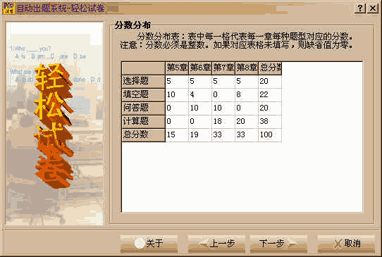 5.设置分数分布:这是最重要的一步。你可以设置每一章每一种题型的分数,同时,程序将计算出每一章节、每一题型和试卷的总分。当然,某些章节的可能没有某些题型,你只须把分数设置成0分即可。