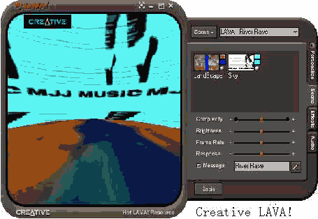 Audio时给你演示极其动感的三维动画,而且三维物体会智能地随着音调、节奏而跳动。更吸引人的是,用户可以轻松地自定义三维物体的图案纹理。在听音乐的同时欣赏配合音乐的三维动画,无疑会大大加强音乐的感染力。使用LAVA!至少要有Live!Ware