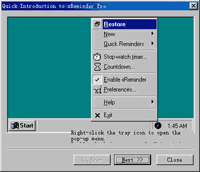 设置好了事件提醒,在“Tools→Preferences”下选中“Load program on startup”,则每次启动Windows 95时自动加载XReminder,启动后,XReminder平时只会静悄悄地停留在系统托盘中,在设定的提醒事件的时间将到之前,弹出提醒框提醒你该做应该做的事情了,你此时可选择接受,代表你将去做所提醒的事了,该提醒事件将不会再弹出提醒框,或者选择“Snooze”,XReminder将在你设定的若干时间后再次提醒你,直到选择接受为止。