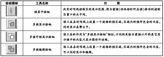 在时间线控制区最下面一行左边,放置着与时间线操作有关的5个工具按钮,其中前面4个按钮的作用在下表中列出: