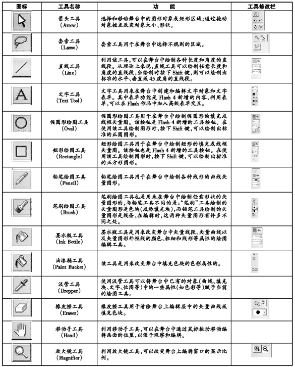 下表列出了Flash 4中的绘图工具按钮图标、名称、功能和相应的扩展工具: