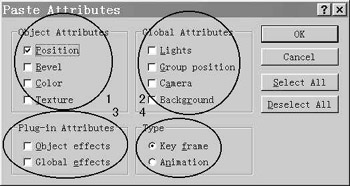 顺便讲解一下COOL 3D 2.5中剪贴板的高级应用。大家可能都有这样的情况,要制作一批特效完全相同或部分相同的文档,但是一次一次地重复制作过程比较烦,COOL 3D 2.5提供了只有在大型文字图形处理程序中才有的高级拷贝剪贴功能。先制作好第一个文档,然后在“编辑(Edit)”菜单中选择“拷贝(Copy)”,再建立一个新文档,输入文字后在编辑菜单中选择“粘贴属性…(Paste Attribute...)”,则弹出如图4的对话框,区域1是选择对象类特效的各个特效是否要粘贴到目标文档;区域2是选择全景特效的各类特效是否粘贴到目标文档,注意颜色特效和光线特效虽然属于同一种特效,但是光线特效只作用于全部文档,而色彩特效可以作用于文档中的不同对象,即文档中先后插入的不同对象可以使用不同色彩,却必须使用同一光线效果。而且在位置属性上分为对象位置和全景位置。区域3选择插件类特效的各个特效是否要粘贴到目标文档。区域4决定是将源文档的当前桢还是整个动画过程效果粘贴到目标文档。
