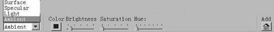 图6是光影色彩特效的属性工具栏,这个特效共包括四部分属性:表面色彩(Surface)、反射色彩(Specular)、光线(Light)和环境色彩(Ambient)。所谓反射色彩就是3D对象表面镜面反射出的色彩,而环境色彩是决定光线对3D对象表面影响的强弱程度。表面色彩、反射色彩和环境色彩的属性工具栏可以调整色彩、亮度、饱和度和色调,使制作者充分调整出自己满意的色彩。而光线的属性工具栏有所不同。