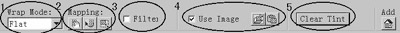 图8是材质特效的属性工具栏,分为5个部分。区域1是材质在3D对象表面的显示模式。所谓材质就是一幅贴在3D对象表面的图像或图形,这个区域就是用来决定材质图像是如何贴到3D对象上去的。平面模式(Flat)下材质图像不进行任何变形而直接使用原样;圆柱模式(Cylindrical)让材质图像进行变形,形成滚卷在一个水平放置的圆筒上的效果(垂直弯曲、水平不变);球体模式(Spherical)让材质图像变形形成球面效果;倒影模式(Reflection)让材质图像变形成为原图像的镜面反射图像。区域2是对材质图像进行位置、大小和旋转,三个按钮从左到右分别是:调整材质图像位置(将材质图像上的某个区域移动到3D对象上的一个特定区域)、旋转材质图像和调整材质图像大小。区域3是一个平滑材质图像的选项,当材质图像分辨率比较低,但3D输出效果要求高的时候选中此项可以得到更平滑过渡的材质。在区域4中你单击靠左边的按钮,则弹出一个显示硬盘上图形文件的对话框,你可以使用任何24位色的JPG或BMP图像作为材质,甚至可以让你的照片出现在3D对象表面!单击右边的按钮是将当前剪贴板上的内容作为材质使用。区域5是清除底色按钮,一般情况下3D对象缺省的底色是土黄色,而且在选择材质后还可以改变3D对象的色彩,单击此按钮则清除一切底色,只使用材质的原色。