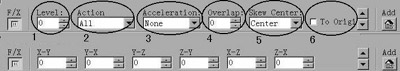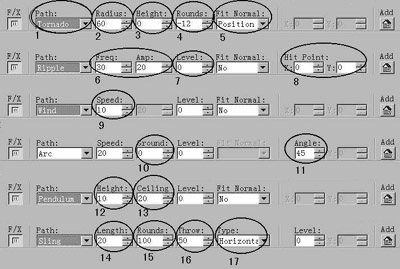 第六行工具栏是运动方式为铁饼投掷(Sling)时的属性工具栏。此运动方式模拟铁饼运动员投掷铁饼的动作,先将3D对象加速旋转,最后从右方甩出。区域14长度(Length)决定3D对象整个动作的范围大小。区域15圈数(Round)设定3D对象加速旋转的圈数,每100增量为1圈,有正反旋转(正负数值)之分。区域16甩出点(Throw)设定3D对象在旋转到什么位置时被甩出,例如,数值0表示不发生旋转而直接甩出,数值90表示旋转到第一个半圈时被甩出,此数值要注意与圈数相配合,如果大于圈数则3D对象不会被甩出,小于圈数太多又会造成在完成被指定的旋转圈数之前就早早被甩出。区域17设定整个动作是在水平方向(Horizontal)还是在垂直方向(Vertical)被完成。