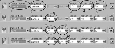 图13是对象舞蹈特效的属性工具栏,所谓舞蹈特效就是让3D特效字的字母在屏幕上翩翩起舞!图中所显示的4个属性工具栏按选择区域1中的舞蹈模式(Dance Mode)的不同所不同,舞蹈模式分为摇摆式(Shake)、发散式(Scatter)、波浪式(Wave)和跳跃式(Bounce)。区域2的次序属性(Sequence)与前面讲到的动作属性(Action)类似,决定各个字母的动作顺序。区域3是舞蹈速度属性(Tempo),数值范围是1到10,10是全速。区域4是舞蹈变化复杂程度属性(Variation),数值从0到100,100是最复杂的舞蹈变化。区域5中的数值只在区域2的次序属性为随机顺序(Random)时发生作用,决定字母的舞蹈变化类型。取值从0到32767。第二行工具栏是舞蹈模式为发散式时的工具栏,区域6是发散的半径(Radius),决定发散的范围有多大。第三行工具栏是舞蹈模式为波浪式时的工具栏,区域7选择波浪的频率(Frequency),即在10帧动画中有几个波浪起伏,每10个增量为一个整波浪动作,取值范围为1到100。区域8是波浪的振幅(Amplitude),即波浪的高度,取值范围为1到100。第四行工具栏是舞蹈模式为跳跃式时的工具栏,区域9选择地板(Ground)与跳跃对象起始位置之间的距离,取值从1到10。区域10选择反弹高度(Rebound),即跳跃对象弹起后的高度,取值从1到100,100则表示弹起的高度与起始高度一样。