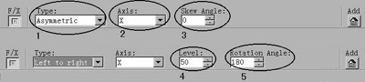 当扭曲方式为从左到右(Left to Right)或从右到左(Right to Left)时,显示第二行工具栏。区域4是级别属性(Level)可以作用于关键帧,设定3D字母的扭曲程度,取值范围是0到100,0是不发生扭曲,100是按扭曲方式中设定的方向发生一次完全扭曲。例如第1帧设定为0,第5帧设定为50,第10帧设定为0,则整体效果为按设定方向发生半次扭曲。区域5是旋转角度属性(Rotation Angle),作用和取值范围等于扭曲角度。
