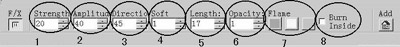 图22是火焰特效的属性工具栏。区域1是火焰强度属性(Strength),用于设定火焰的最高程度,取值范围为10到200,可以作用于关键帧。区域2是火焰摇摆属性(Amplitude),用于设定火焰的摇摆幅度,取值越大则火焰摇摆幅度越大,可以作用于关键帧。区域3是火焰摇摆方向属性(Direction),用于设定火焰向什么方向摇摆,用此属性可以制造出火焰被风吹的效果,可以作用于关键帧。如果在不同帧使用不同的角度,那就是“风中之烛”了!区域4是对象柔化效果(Soft),注意此数值是使对象而非火焰发生柔化效果,取值范围是0到10,数值越大则3D对象与火焰越融合在一起,注意此属性不能作用于关键帧。区域5是火焰长度属性(Length),可以作用于关键帧,使用此属性可以让你的3D对象越烧越旺!区域6是火焰不透明属性(Opacity),用于设定火焰的烈度,取值越小则火势越小,可以制造出烧炭的效果。区域7是火焰颜色属性(Color),三种颜色分别代表火焰的内焰、中焰和外焰的颜色,可以分别修改,而且可以作用于关键帧,制造出火焰变色的动画效果。区域8是内部燃烧属性(Burn Inside),在不选择此项的情况下,是火焰在3D对象外围燃烧的效果;选择此项后造成3D对象填充部分也发生燃烧,此时对象柔化属性(Soft)失效。