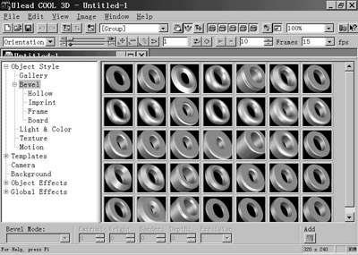 所有的3D对象刚刚显示时都是土灰色色彩,不包括任何动画特效,你可以在此基础上添加各种特效。一般来说,先从对象风格(Object Style)这一大类开始,首先是图库特效(Gallery)。COOL 3D 2.5提供了十几种图库可供选择,所谓图库就是COOL 3D 2.5预先设置好的一些光影、斜面、表面色彩和材质的组合,在后面介绍的操作中你可以向图库中添加自己的个性组合。在图库中有几种特效是动画效果的,如果你制作静态3D对象时选择了它们,则显示的只是动画效果中的第一帧。
