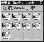在 Word 2000 中配备了专用的Office剪贴板,与一般的Windows剪贴板不同的是,Word 2000允许您把多达12段来自不同文档的信息粘贴在剪贴板上(图2),然后每次在需要的地方插入它们中的一个,或者一次性插入它们中的多个或全部。这项改进在需要从多个不同程序、文档中复制内容的场合里特别有用。再也不必在不同文档之间前后跳转来剪切和粘贴。不过这一功能只能在Office 2000 的应用软件之间使用,只有最后一次复制的信息才可以粘贴到Office家族之外的软件中。