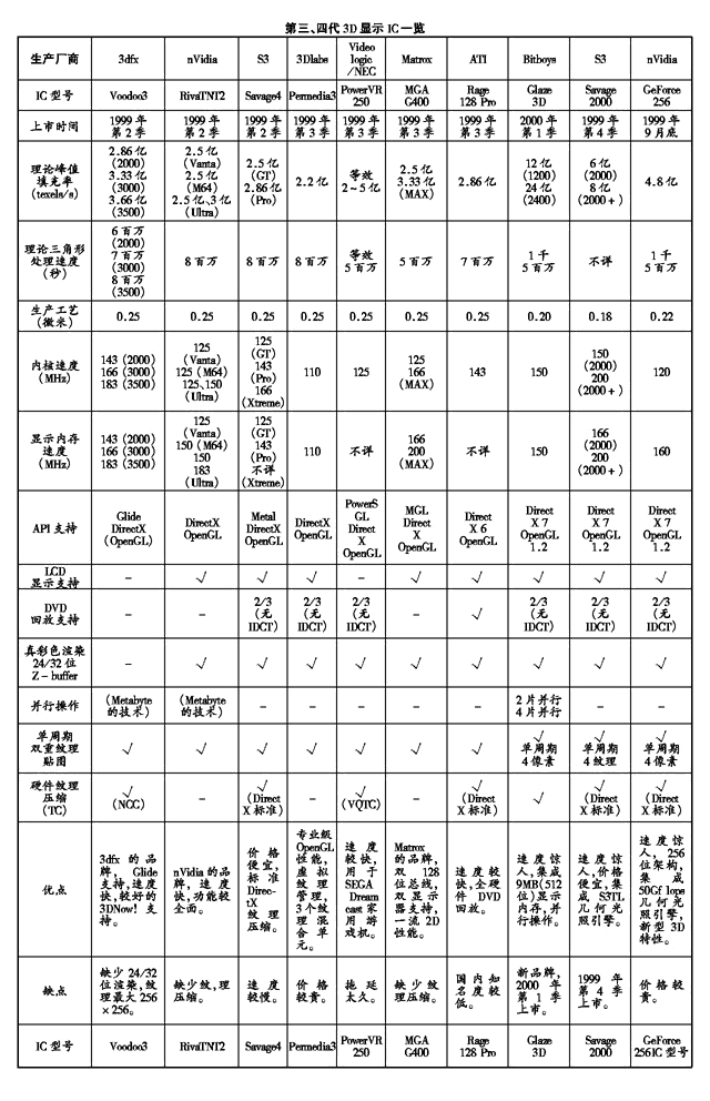 1999年初开始上市的第三代3D芯片产品,虽然从技术上与上一代并无本质的区别,但从性能上却迈了一个台阶。3dfx的Voodoo3最早出现,速度仍旧一流,但不支持新一代产品均有的真彩色渲染和高位数Z-buffer;nVidia的Riva TNT2,具有完善的3D功能和一流的速度,并受到了广泛的支持; S3公司再接再厉,很快又推出了价廉物美的Savage4系列,可惜64位的显示内存降低了性能;Matrox也不甘人后,又设计出图形质量超群的G400及其MAX版,成为niva TNT2的强劲对手;迟迟推出的3Dlabs Permedia3虽然不再有最高的性能,但保证了专业设计市场的基本需求;ATI的增强型Rage 128 Pro更进一步提高了性能。