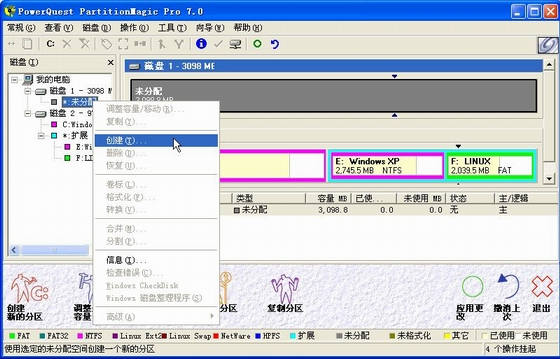 1.安装好分区魔术师(以7.0汉化版为例)后,点击“开始→所有程序→PowerQuest PartitionMagic Pro 7.0→PartitionMagic Pro 7.0”选项,启动PartitionMagic。在窗口中找到未分区的“磁盘1”,然后选择“*:未分配”右键菜单中的“创建”命令(见图1)。