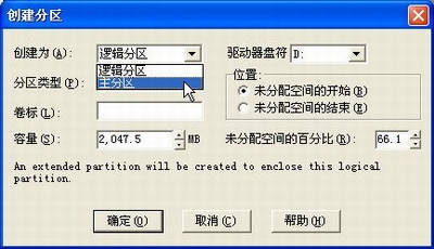 2.弹出“创建分区”窗口,可以看到有主分区和逻辑分区两个选项。如果要安装操作系统,请选择“创建为”下拉列表中的“主分区”选项(见图2)。