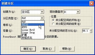 3.选择好后,单击“确定”按钮。然后根据类似的方法,将剩余的空间创建成文件系统为FAT格式的逻辑分区(见图4)。