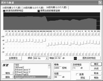 现在再听听效果,人声是不是不见了?如果你觉得在消除人声的同时,部分乐器的声音也随之减弱了,那么使用Cool Edit的“效果-滤波器-图形均衡器”(如图2),将低频弥补一些,就能带来更好的音质效果。