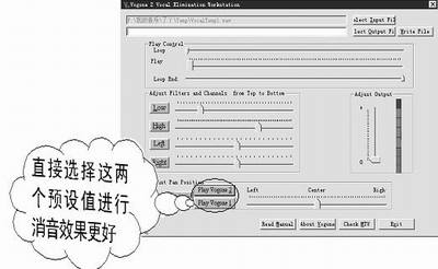 前面两种方法,都不是用专门为消音而设计的软件进行的,下面我们介绍一个专业消人声软件Vogone 2.0(在http://www.midifan.com可以下载到),它能够在很大程度上削减人声在歌曲中的比例,真正地起到消音的作用。