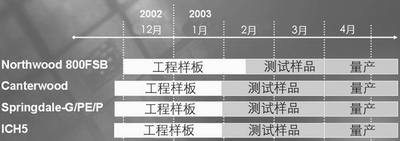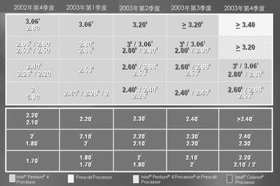 Pentium 4是英特尔的中坚产品,就是凭借Pentium 4创纪录的主频优势,英特尔才能给予AMD沉重的打击。2003年533MHz前端总线的Pentium 4将推出从2.8GHz到3.06GHz的产品,3.06GHz还具有Hyper-Threading(超线程)技术。之后英特尔的前端总线(FSB)频率将跳过667MHz,直接提升到800MHz,因此将另行推出一系列新的Pentium 4:主频为2.4/2.6/2.8/3.0/3.2GHz甚至更高,不但具有800MHz前端总线,而且还全部采用超线程技术。