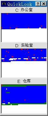 别看它个头小,功能却不凡。运行之后,它就打开一组小窗口(图2),里面每个磁盘分区占用一个,显示磁盘映像一目了然。其中蓝色部分是已用空间,白色是未用空间,红色就是文件碎片,而黑色是禁止移动的文件。虽然窗口很小,却让我们直观地看到了磁盘文件的分布情况。如果发现碎片较多就需要启动整理工具以查看详细情况,如果“全国山河一片红”那就更得尽快整理。